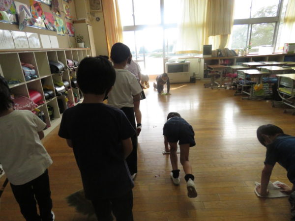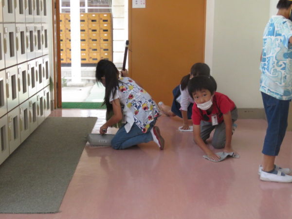 廊下をきれいにする1年生。掃除の仕方をしっかり覚えました。