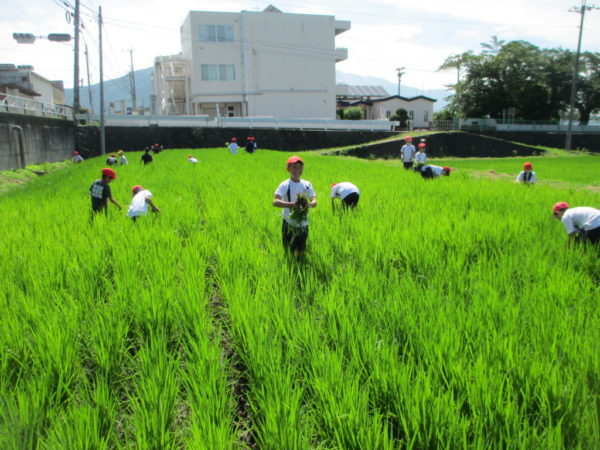 本日7月14日、一校時目の比較的、涼しい時間に5年1組が田んぼの雑草を抜きました。