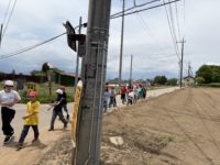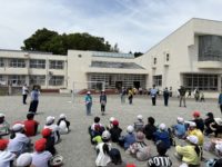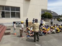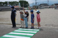 1、2年生は道路の安全な渡り方を教わり、実際の道路へ。
