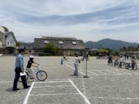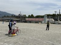 3、4、5,6年生は校庭で自転車の乗り方を教わりました。