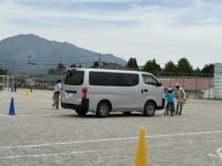 校庭に描かれたコースを走りながら、道路を横断する際、障害物がある際の運転方法などを学びました。