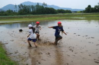 最後には,子どもたちは大はしゃぎで田んぼの中を駆け回りました。田んぼにダイブして,全身どろだらけになる子も。