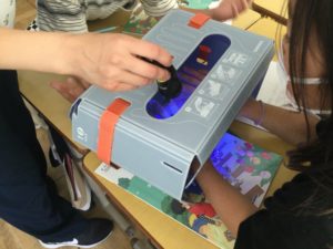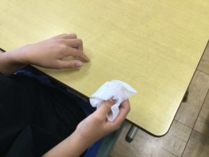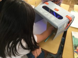 まずは,自分の手や身の回りのものが「汚れていないようにみえて意外と汚れていること」を実感。