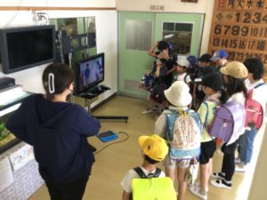 玄関内に設置されたモニターには,児童会御本部役員が作成した動画が流れています。
