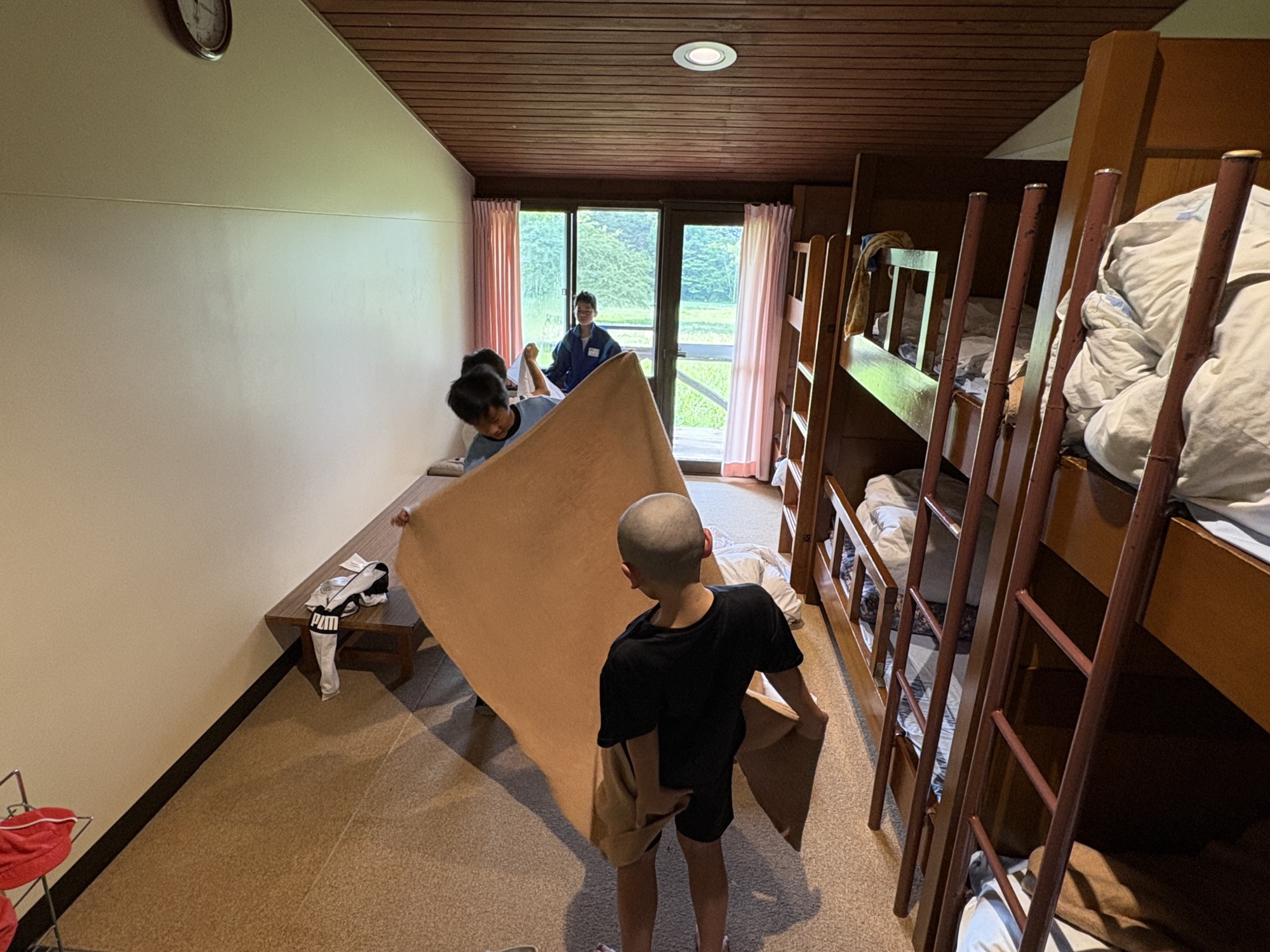 2025年6月27日 / 最終更新日時 : 2025年6月27日 高根西小 自然教室 自然教室2日目 おはようございます。 自然教室2日目をむかえました。窓の外には,穏やかで爽やかな朝が広がっています。 一方,部屋をのぞくと,すでに活動はせわしく始まっていました。 せわしさの理由、それはもちろん「ベッドの片付け」 昨日のオリエンテーションを思い出しながら,片づけています。 「し・か・も・まくら」「たて・たて・よこ・よこ」 まちがえずにできたかな? ここでも、やっぱり友だちに寄り添う5年生。