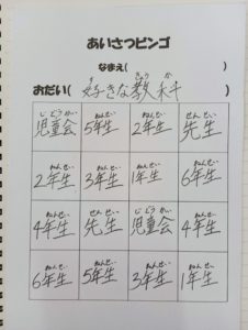 2025年9月5日 / 最終更新日時 : 2025年9月9日 高根西小 全校 あいさつビンゴ 業間休みに「あいさつビンゴ」が行われました。 今回のテーマは『好きな教科』です。 同学年の友だちに,異学年の友達に,そして先生に, 積極的に声をかけてビンゴのマスを埋めていました。 同じ教科を好きな友達に出会えたかな? 外は雨で遊べない分,校舎内で交流を深めることができました。