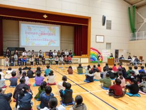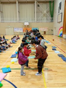 6年生へのプレゼント渡し。みんなで作ったメッセージ色紙を1年生から渡しました。