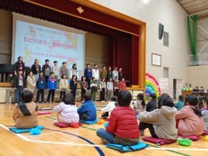 子どもたち,そして教職員は手に「花」。歌に合わせて心をこめて振りました。