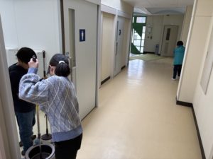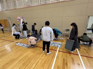 体育館の清掃、机・椅子並べ、卒業制作の掲示など、様々な仕事を分担して行いました。