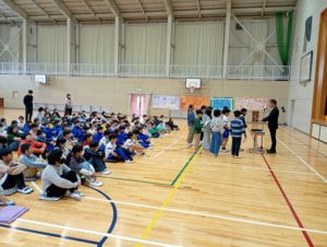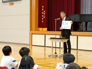 業前の時間に、学校集会が行われました。