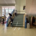 校舎内を児童が安全に移動できるよう 廊下、階段の一部にセンターラインや矢印を設けました。 意識して歩く子どもも増えています。